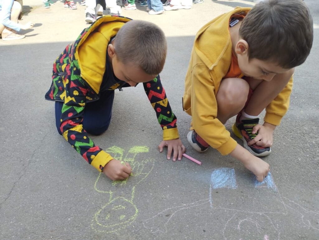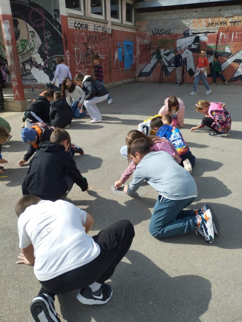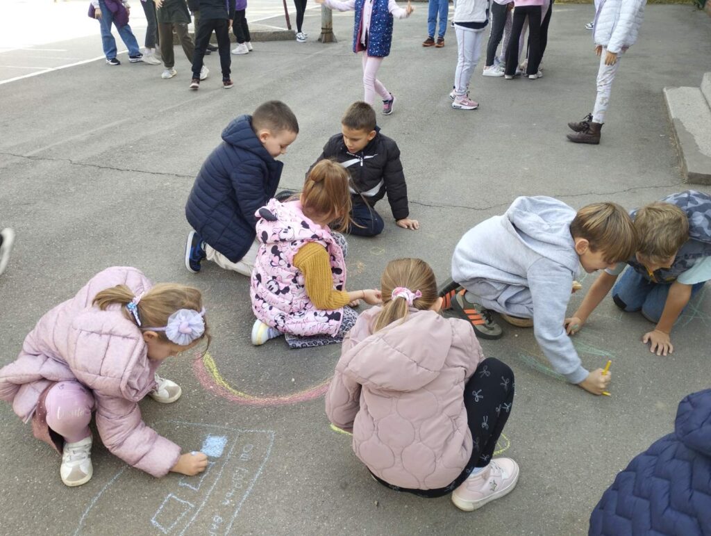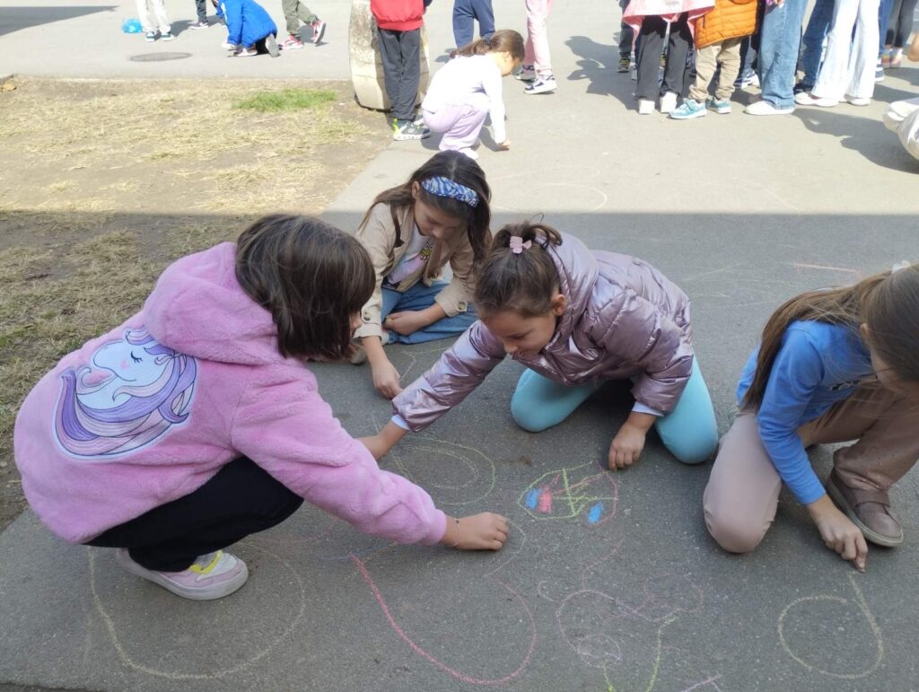 Посебно весело било је у школском дворишту, где су прваци и петаци заједно цртали кредама. Њихови шарени радови, пуни маште и боја, улепшали су школско окружење и подсетили све присутне да је детињство време игре, смеха и стваралаштва.