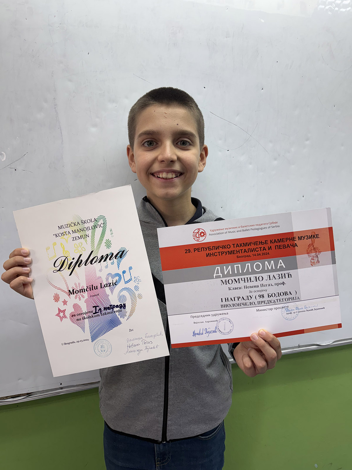 Такође, остварио је сјајне резултате на Школском такмичењу и Републичком такмичењу камерне музике инструменталиста и певача, из виолончела освојивши 1. награду.